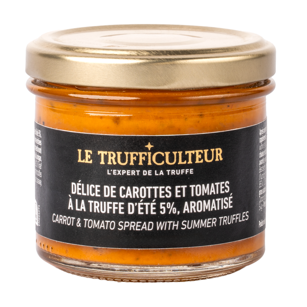 Carrots (50%), tomatoes (21%) (semi-dried tomatoes 70%, tomato concentrate), rapeseed oil, summer truffle (5%) (Tuber aestivum), lemon juice (from concentrate), natural flavorings, salt, caraway, garlic, oregano, sugar, harissa-flavored spices.